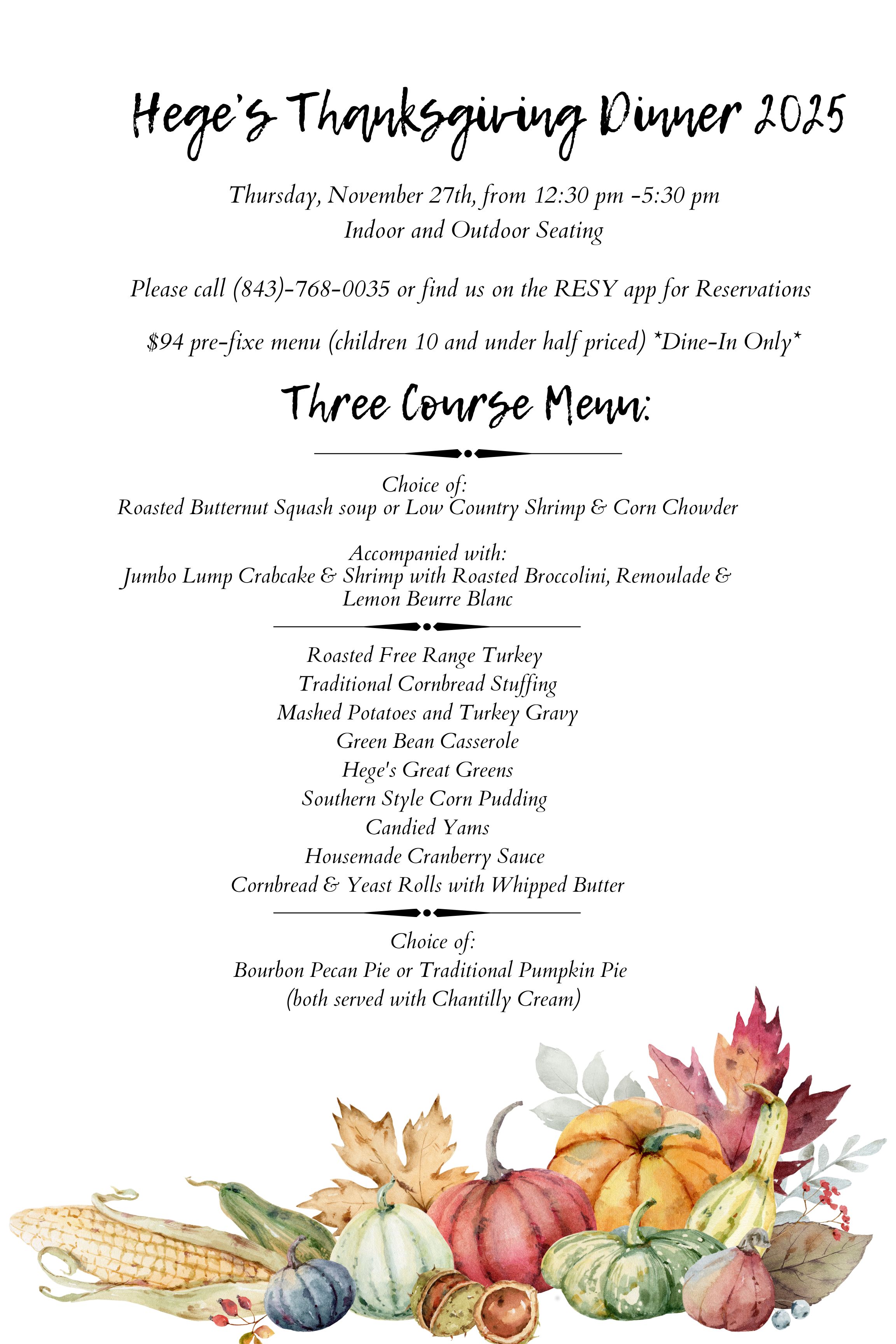 Hege's is a casual, welcoming French Bistro where you'll experience the same gracious hospitality as the coastal gentry of Kiawah and Seabrook Islands. No foams. No froths. Just respect for the ingredients, the season, and time and talent in the kitchen. For classic French and international cuisine in a casual, inviting atmosphere, visit Hege's Restaurant. Offering dinner six days a week, Hege's menu features fresh seasonal products prepared with classical sauces.